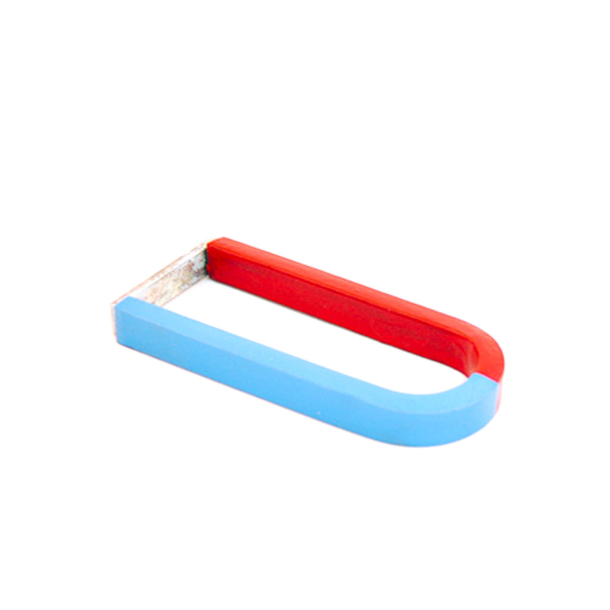 Imán en forma de herradura, con polos marcados de color; el polo norte de color rojo y su polo sur de color azul.