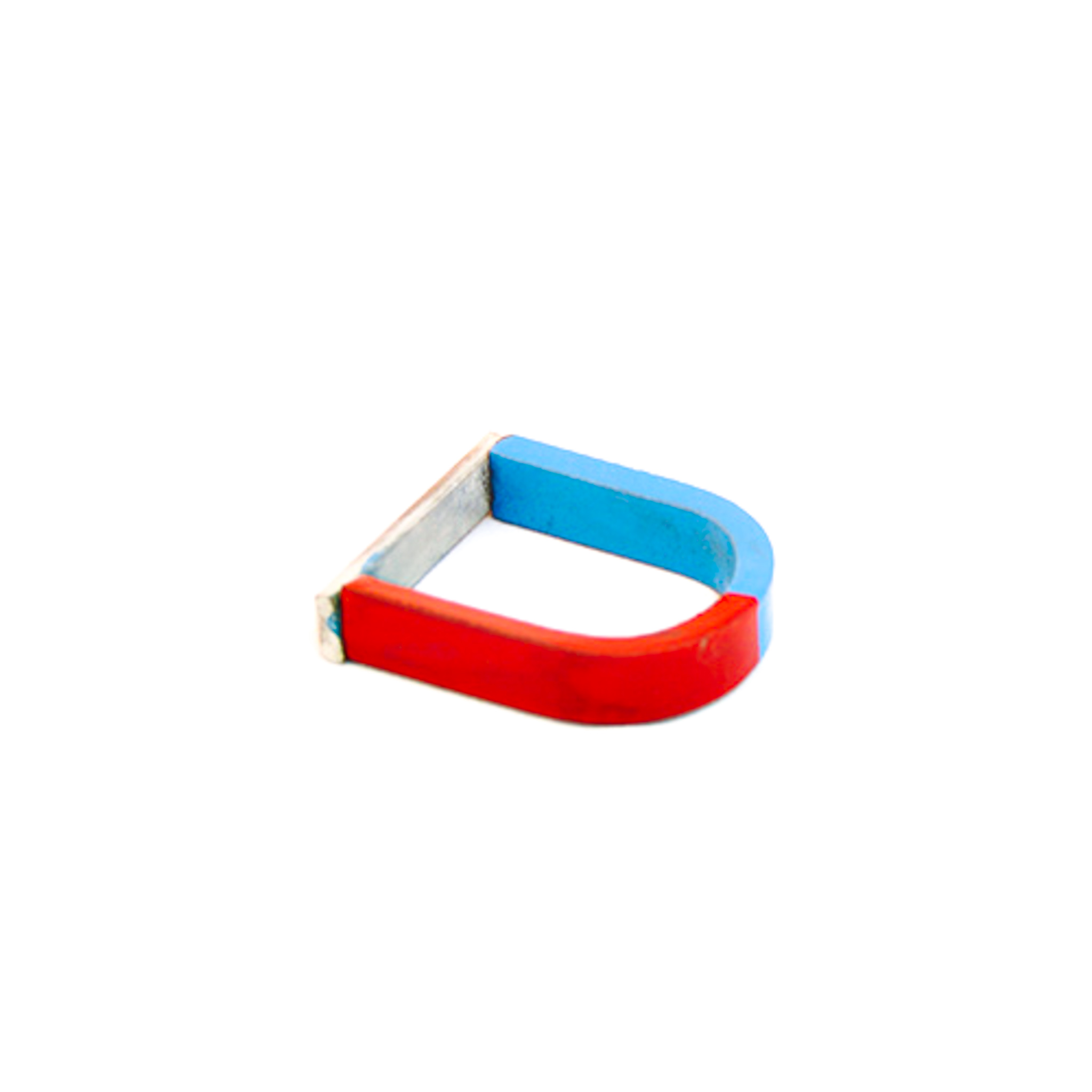 Imán en forma de herradura, con polos marcados de color; el polo norte de color rojo y su polo sur de color azul.