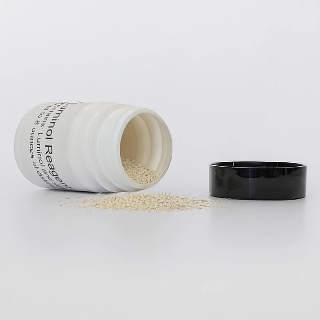 El luminol es un compuesto químico utilizado en forensía para detectar trazas de sangre mediante quimioluminiscencia. Cuando se mezcla con agua y se rocía sobre una superficie, reacciona con el hierro presente en la hemoglobina de la sangre, produciendo un resplandor azul visible en la oscuridad. Esta reacción es muy sensible y puede revelar manchas de sangre incluso si han sido lavadas o son muy antiguas.​