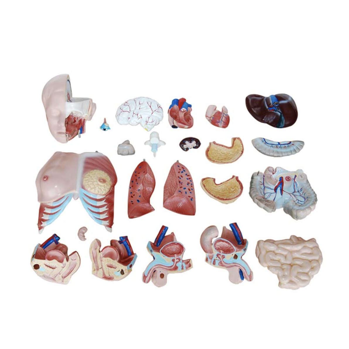 | Piezas desprendibles: | Diseccionado en 23 partes: torso, pectoral femenino, cabeza, globo ocular, cerebro, vértebra, nervios espinales, pulmón (2), corazón (2), hígado, riñón, estómago (2), intestinos (4), genitales masculinos (2), genitales femeninos con feto (3) |
