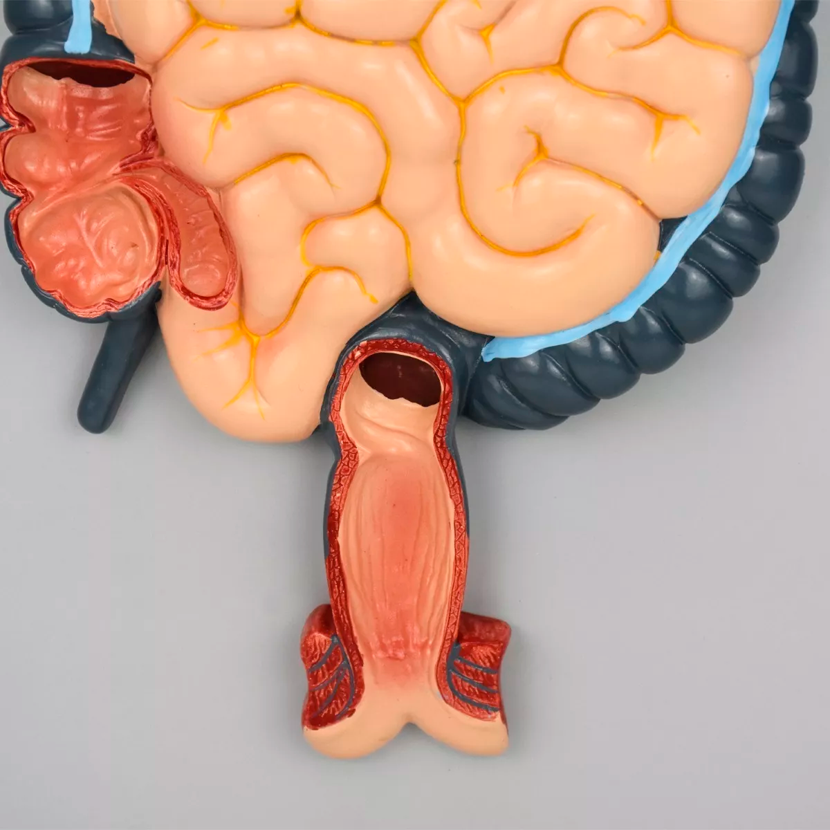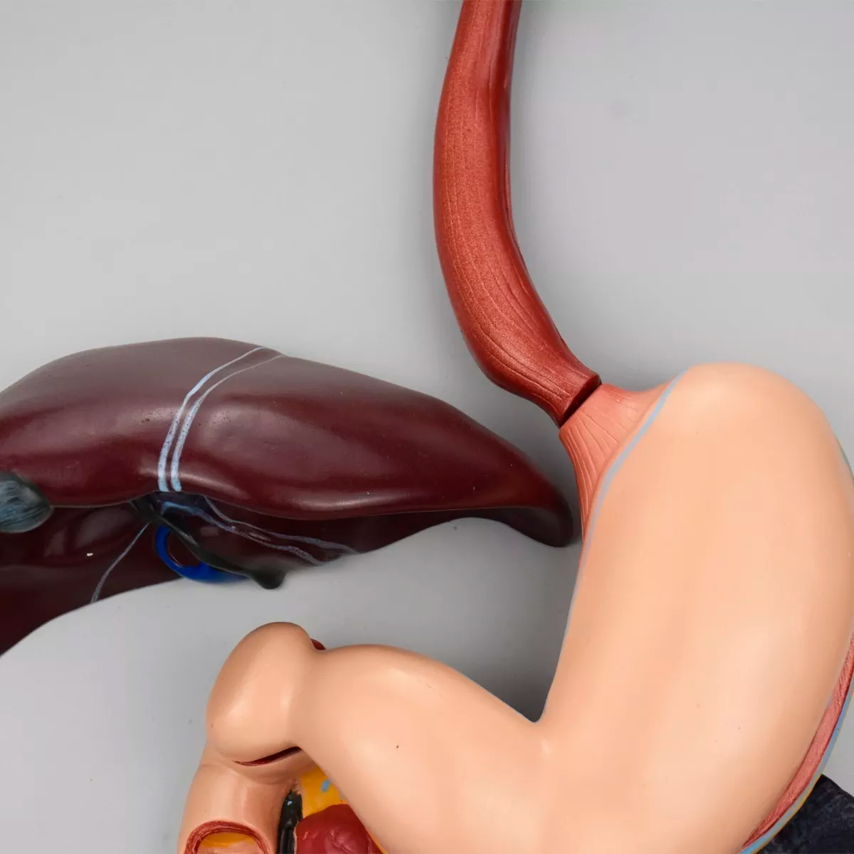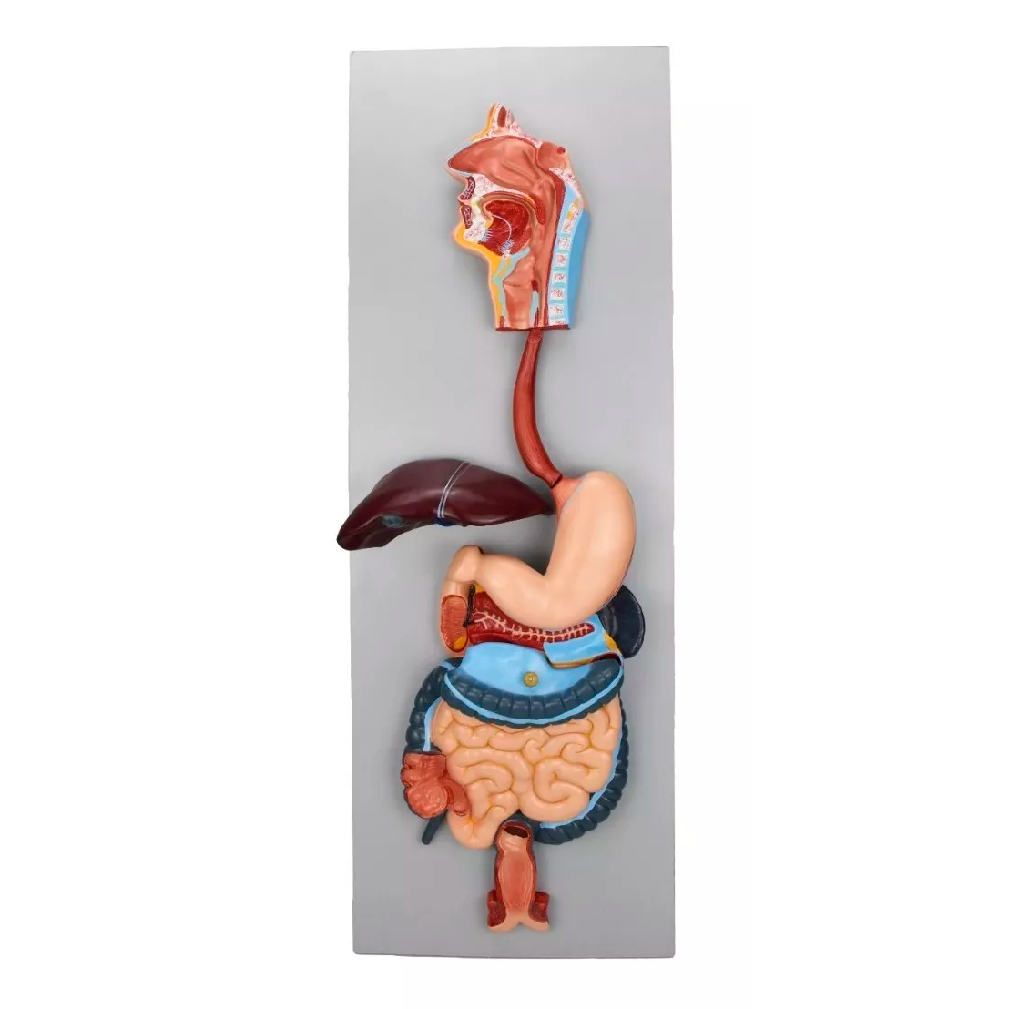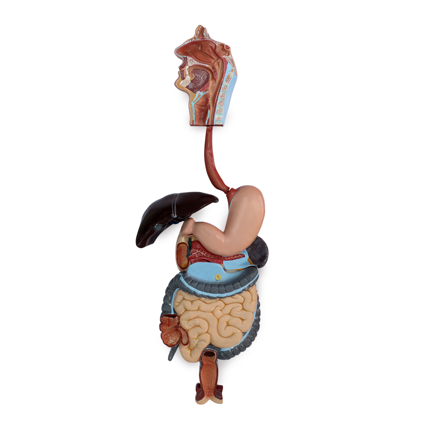 | Que se observa: | Este modelo del sistema digestivo a tamaño real muestra todo el sistema digestivo en relieve gráfico. Cuenta con: nariz, cavidad bucal y faringe, esófago, tracto gastrointestinal, hígado con vesícula biliar, páncreas y bazo. El duodeno, ciego y recto del sistema digestivo están abiertos. |