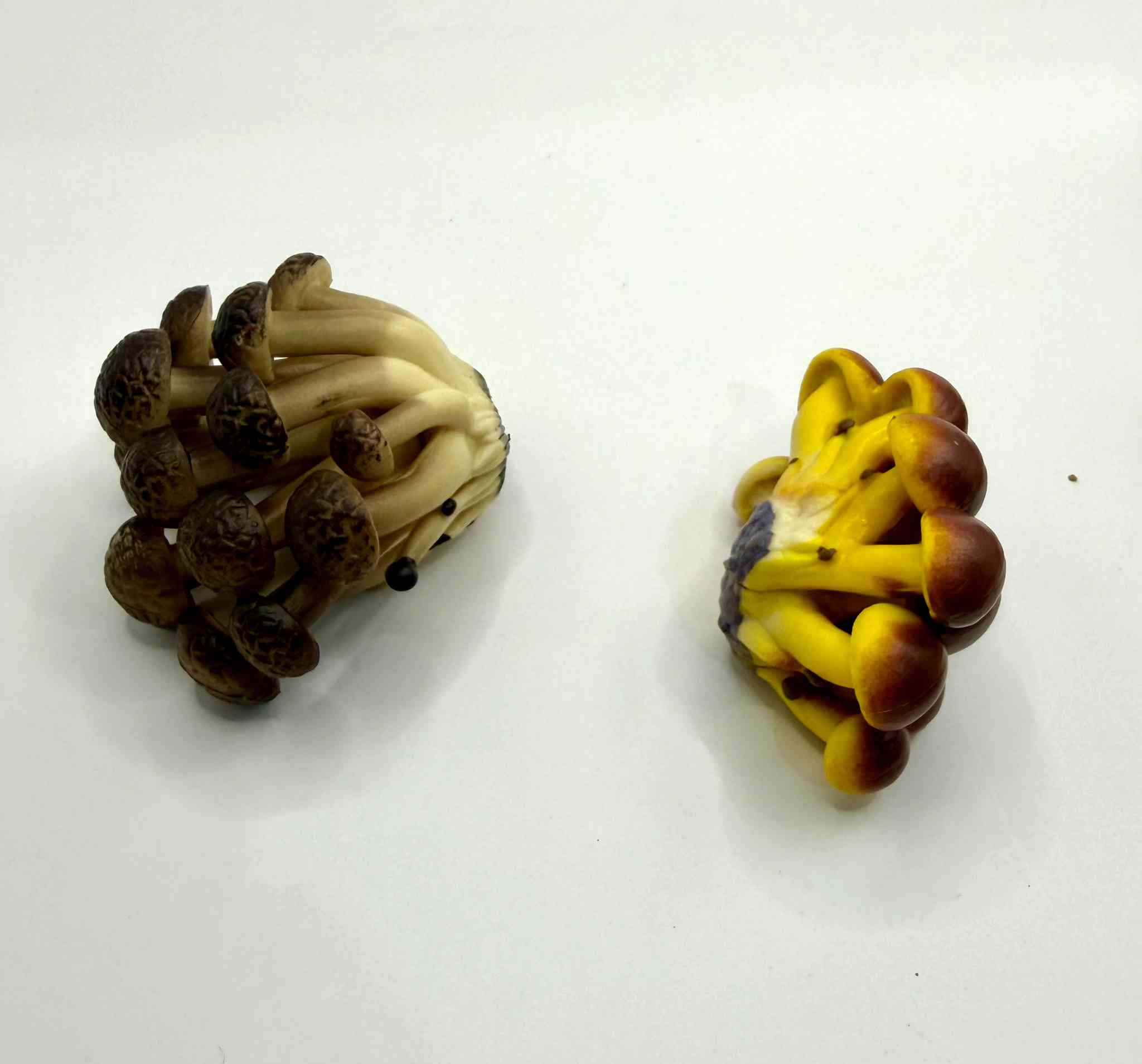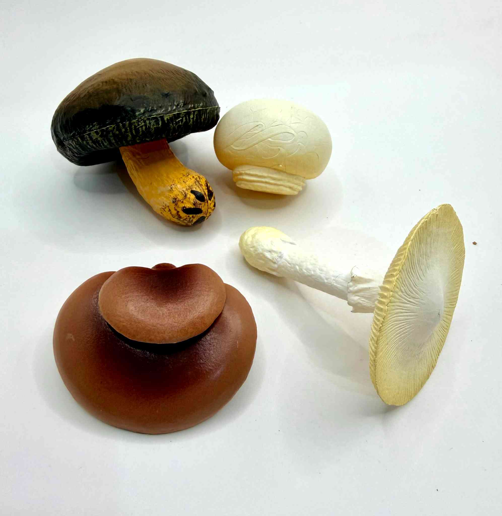 12 piezas, incluyendo representaciones de la clásica Amanita (con su sombrero rojo y escamas blancas), el hongo Boleto, variedades de Agaricus y otros hongos silvestres.