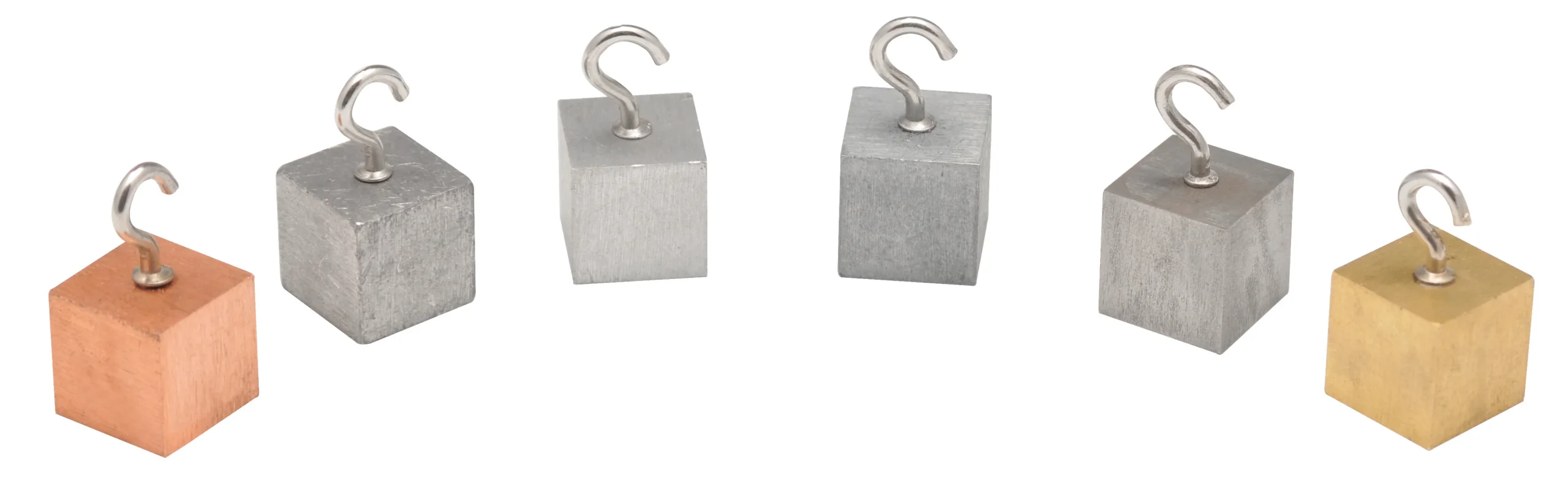 Juego compuesto por 6 cubos de los siguientes materiales: latón, plomo, zinc, cobre, aluminio y hierro, cada uno con gancho incorporado.