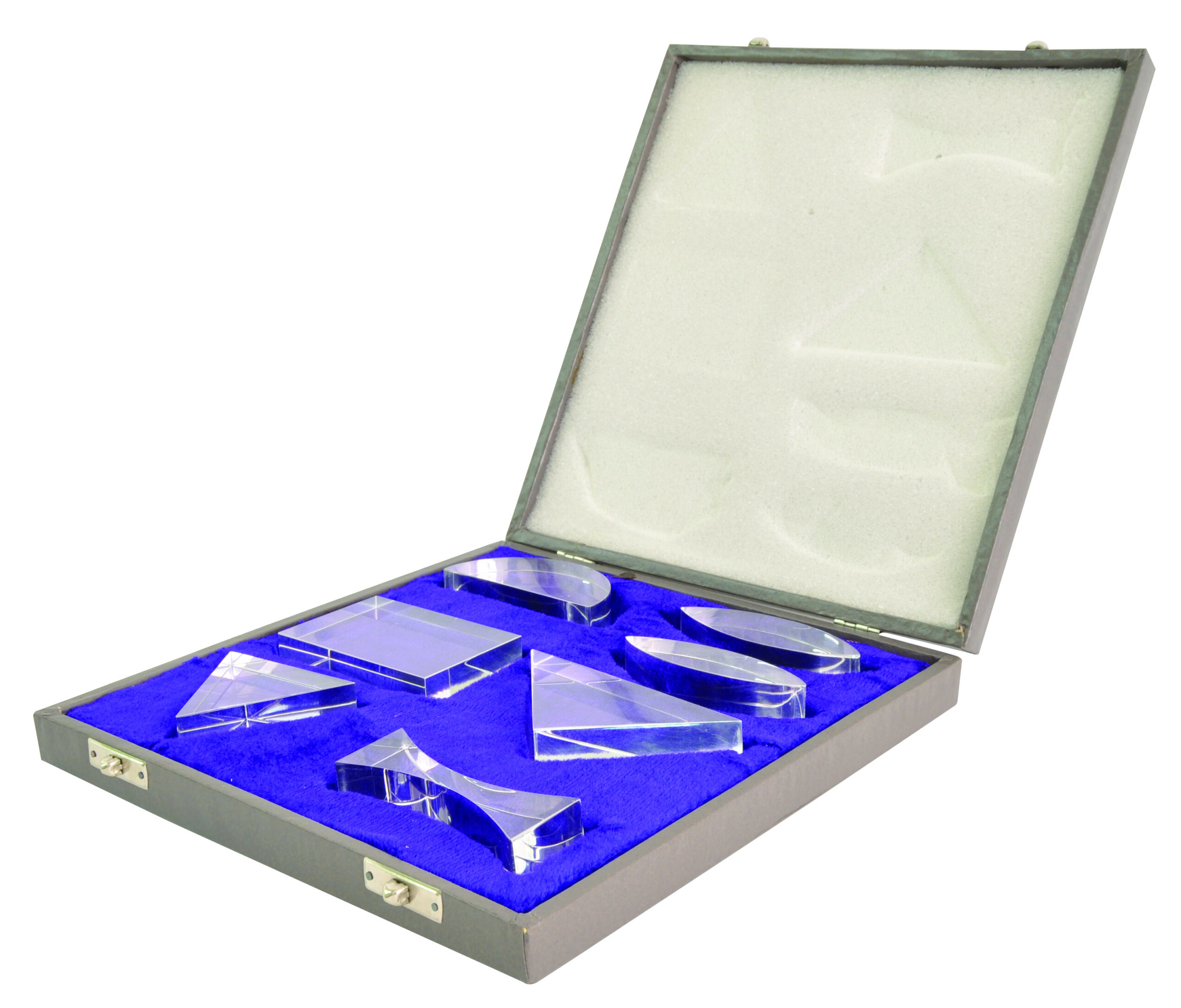 Juego de siete bloques de acrílico. El set incluye un rectángulo, un semicírculo, un bloque biconvexo, uno biconcavo y tres bloques triangulares de tamaños variados. Viene con una caja de madera para almacenamiento seguro.