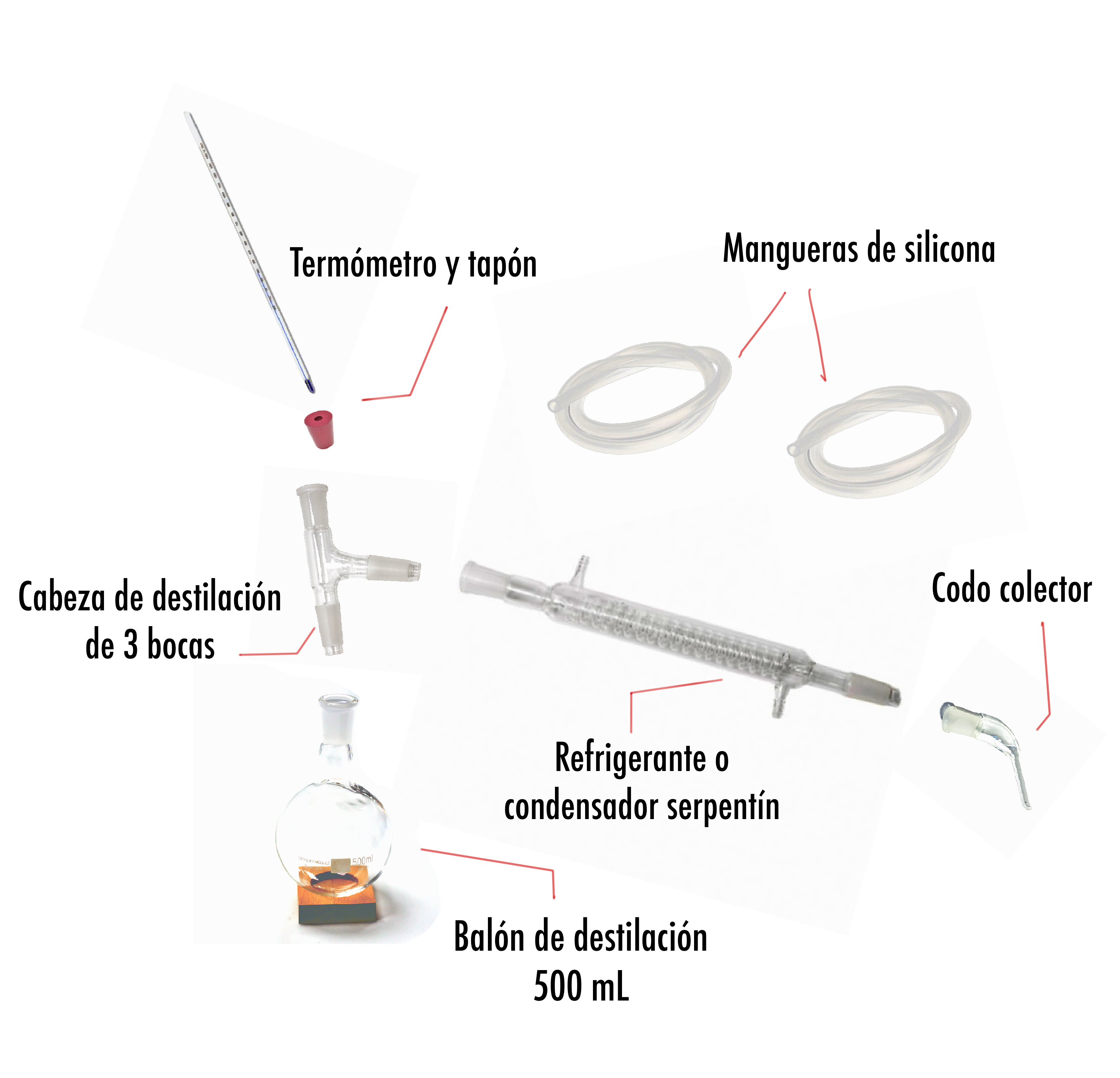 El sistema de destilación incluye materiales de vidrio de borosilicato de alta calidad con uniones herméticas esmeriladas, un termómetro y mangueras de conexión para la refrigeración del condensador.