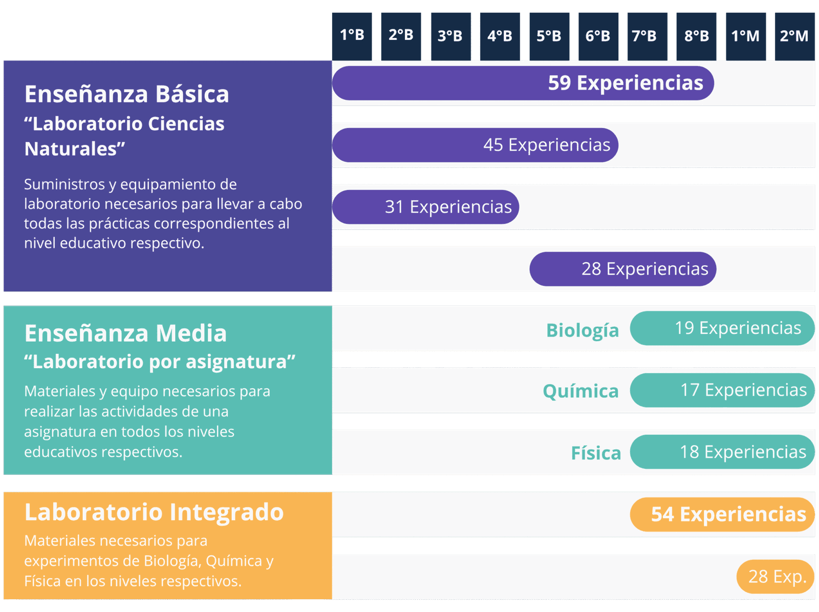 Experimentales y científicas, diseñadas para facilitar la enseñanza desde básica a media, alineadas con los objetivos de aprendizaje del Mineduc.