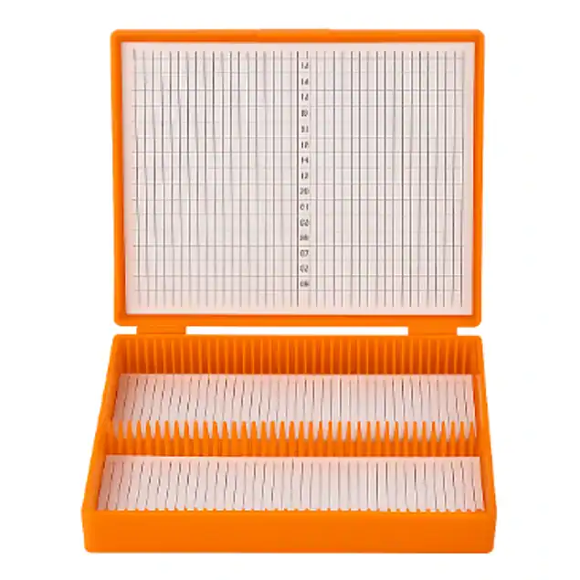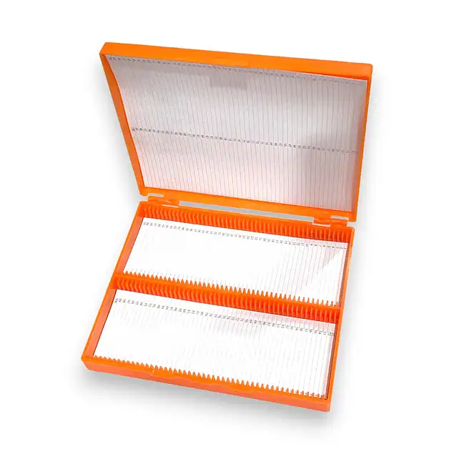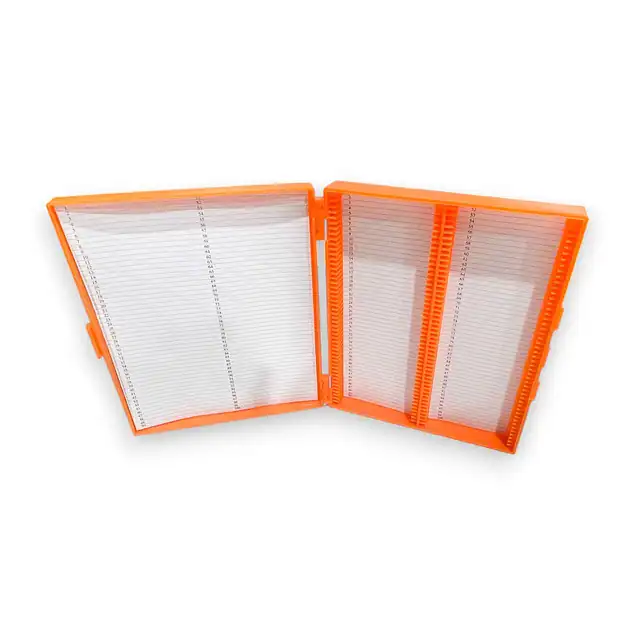 Cuenta con ranuras numeradas del 1 al 100 que mantienen cada portaobjetos en posición fija, evitando el contacto entre ellos y reduciendo el riesgo de daños.