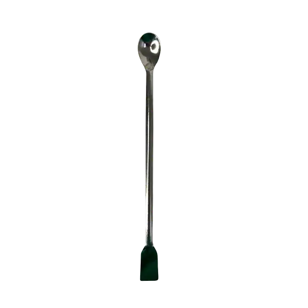 Espátula de doble extremo fabricada en acero inoxidable de alta resistencia y fácil esterilización. Un extremo en forma de cuchara para toma y transferencia de muestras, y el otro plano para mezcla, raspado o manipulación.