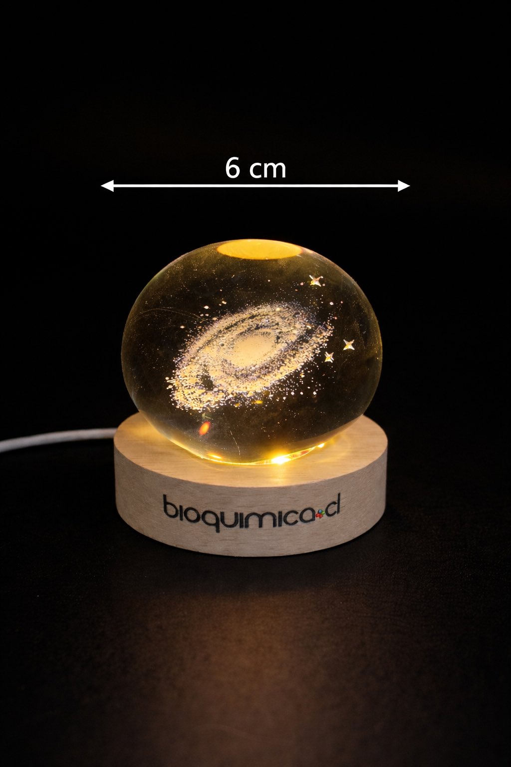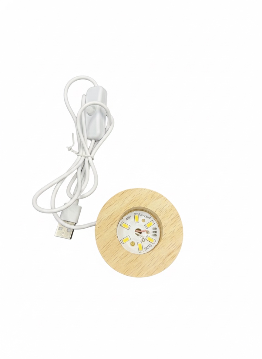 - Incluye una base de madera con iluminación LED integrada, alimentada mediante conexión USB.