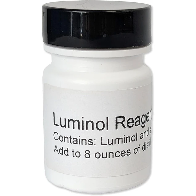 El luminol es un compuesto químico utilizado en forensía para detectar trazas de sangre mediante quimioluminiscencia. Cuando se mezcla con agua y se rocía sobre una superficie, reacciona con el hierro presente en la hemoglobina de la sangre, produciendo un resplandor azul visible en la oscuridad. Esta reacción es muy sensible y puede revelar manchas de sangre incluso si han sido lavadas o son muy antiguas.