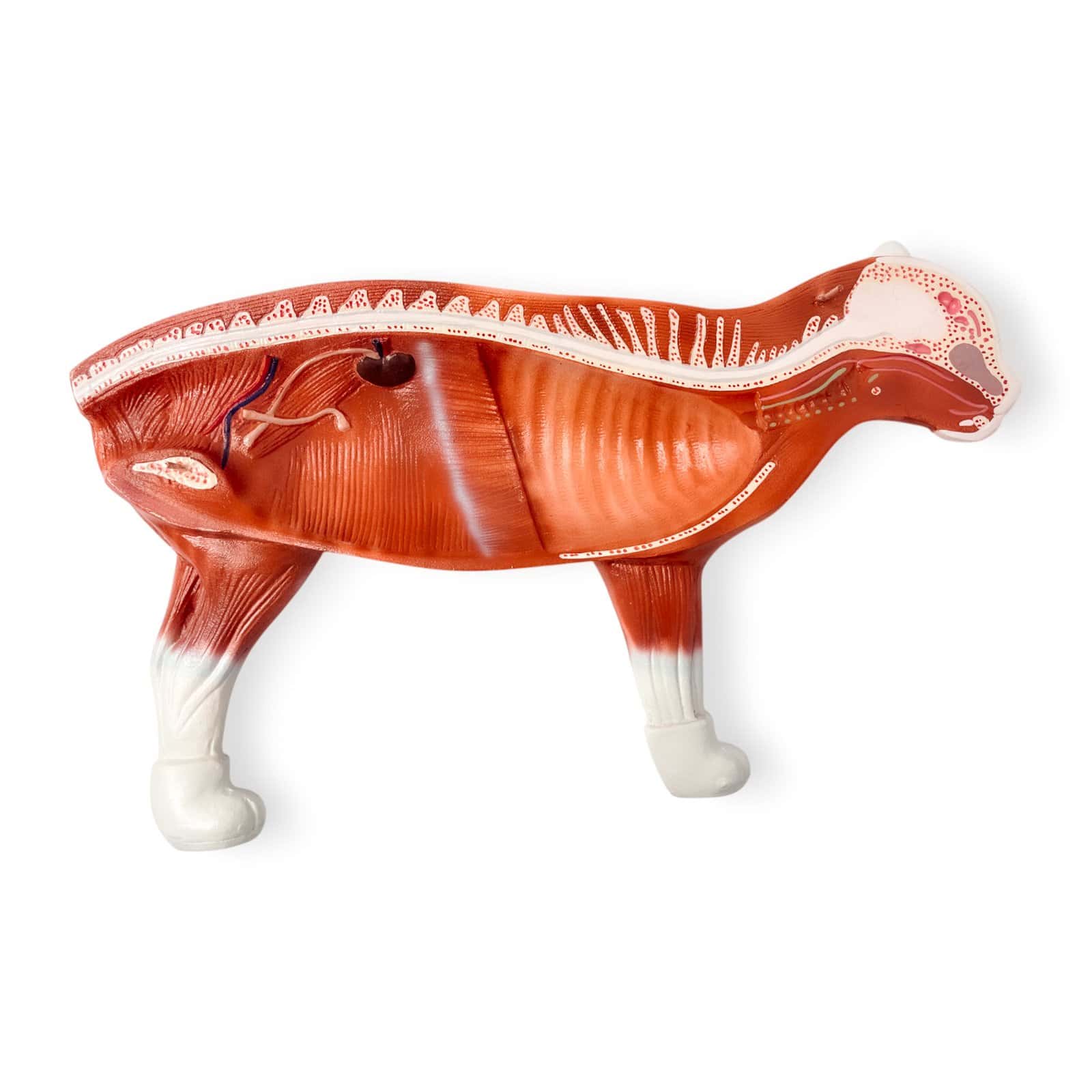 El modelo se separa a lo largo del plano medio y permite observar órganos y sistemas en detalle. Incluye 11 partes removibles, que representan órganos principales del sistema digestivo, reproductivo y otros.