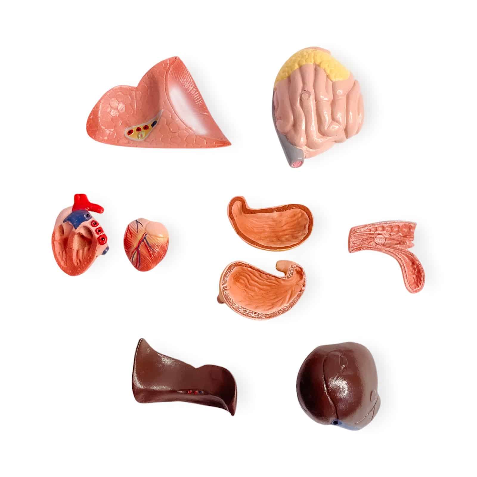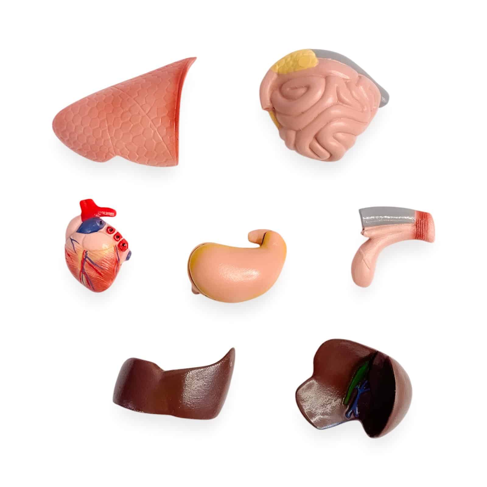 - Partes removibles: corazón (2 partes), estómago (2 partes), hígado, bazo, páncreas, pulmones, intestinos.