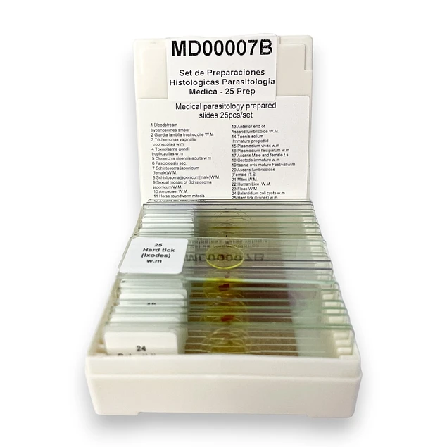 15. Plasmodium vivax 16. Plasmodium falciparum 17. Corte transversal de Ascaris lumbricoides (macho y hembra) 18. Cestodo inmaduro 19. Taenia ovis madura 20. Corte transversal de Ascaris lumbricoides (hembra) 21. Ácaros 22. Piojos humanos 23. Pulgas 24. Quistes de Balantidium coli 25. Garrapata dura (Ixodes) |