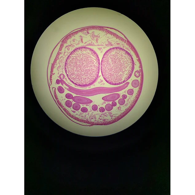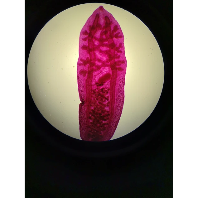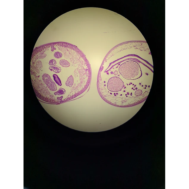 6. Corte de Fasciolopsis 7. Schistosoma japonicum (hembra) 8. Schistosoma japonicum (macho) 9. Mosaico sexual de Schistosoma japonicum 10. Amebas 11. Mitosis en lombriz intestinal del caballo (Parascaris equorum)